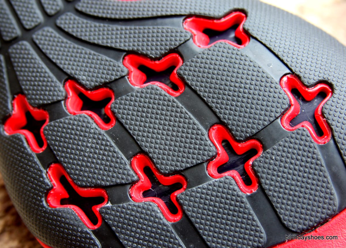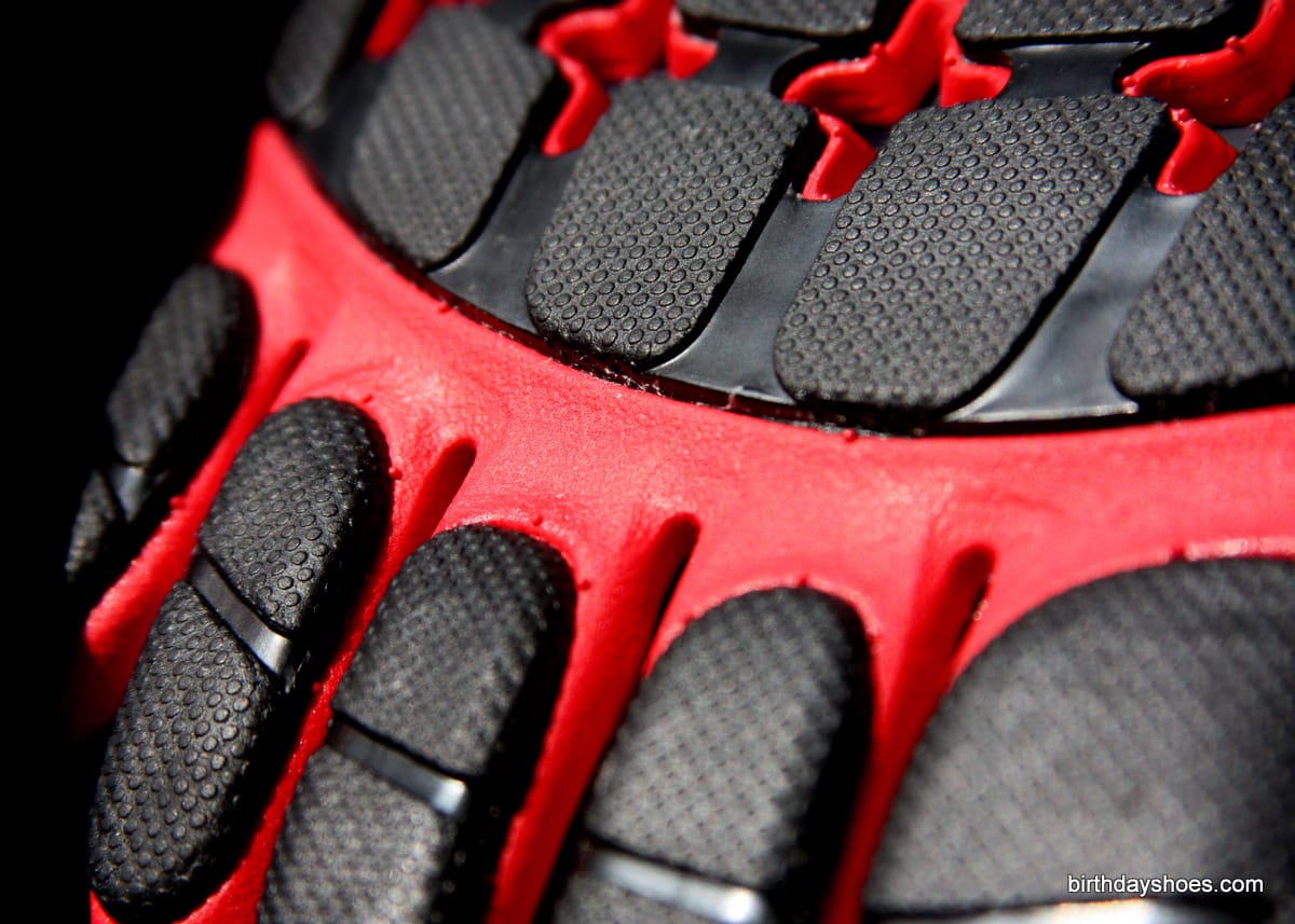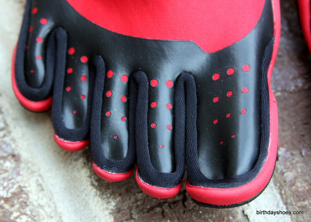 These put on display the innermost material, which appears to add an overall "frame" or structure to the sole. Then there is the red foam and finally the rubber. You can see how the rubber is covering the bulk of the foot and where it stops past the forefoot, each toe gets its own rubber pod. As you likely suspect, this separation lends to increased toe flexibility