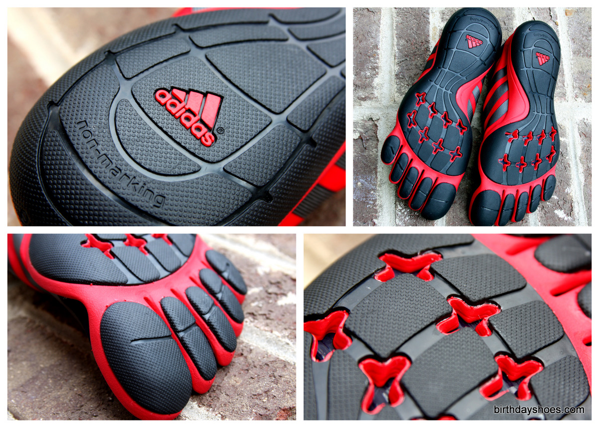 Adidas' toe shoes employ a strapless upper matched to a sole that has five toes and is built using two materials — rubber and some sort of foam (I'm guessing EVA). There may be a third material used to add structure to the sole above the foam — take a look at the sole photos above and note the cross-shaped cutouts.