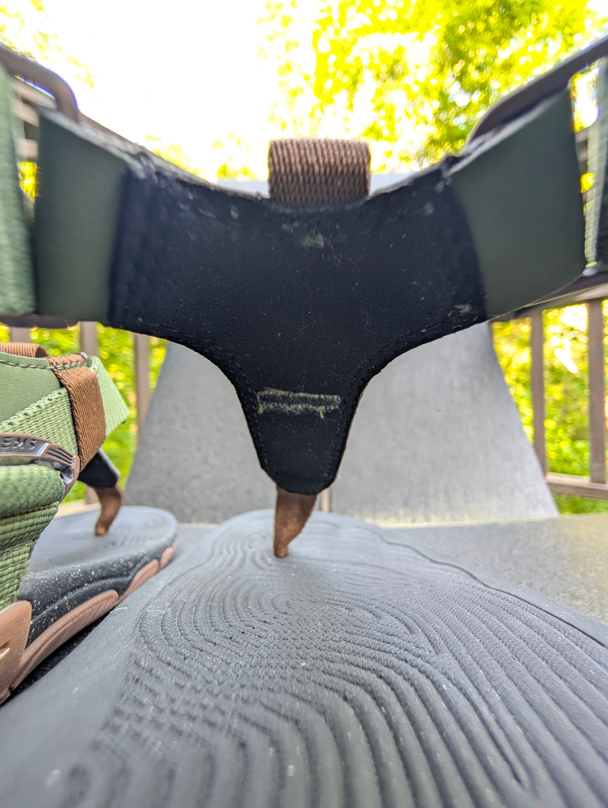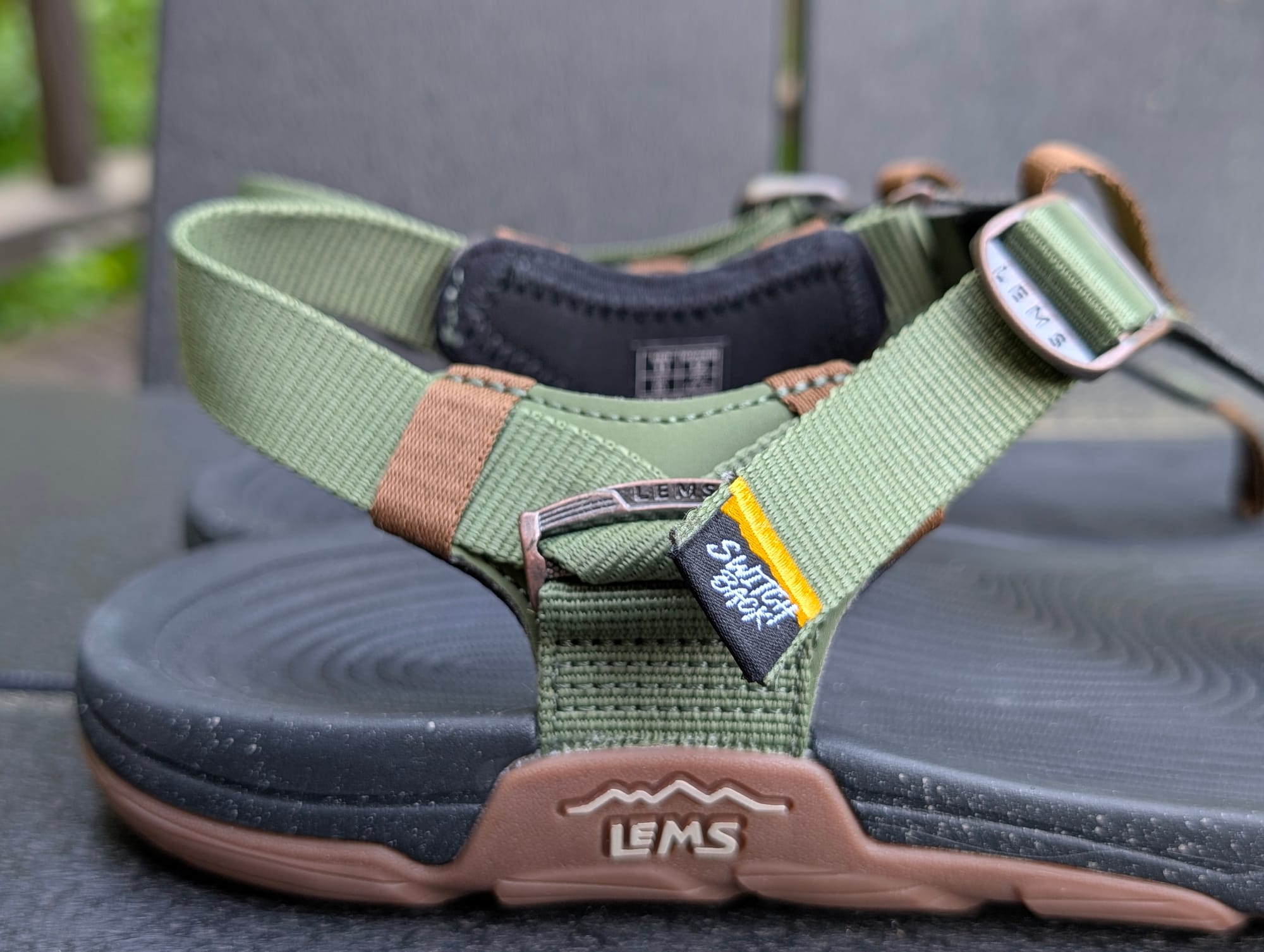 Also, the simplicity of the heel strap is much appreciated. I wouldn't have expected to cite a heel strap as a standout feature, yet here we are: The webbing chosen by Lems for the Switchback is great. It feels substantial and good on my skin. And I appreciate how there's strap — and only strap — on the heel of these sandals. The angle where the straps land on my heel is chef's kiss right. In my testing I never had any issues with slippage on the heel strap and it sits perfectly against my heel. My only complaint is it would occasionally flip over when I'd ram the sandals on quickly, requiring a quick flip with my hands. Mentioned for review completeness only.