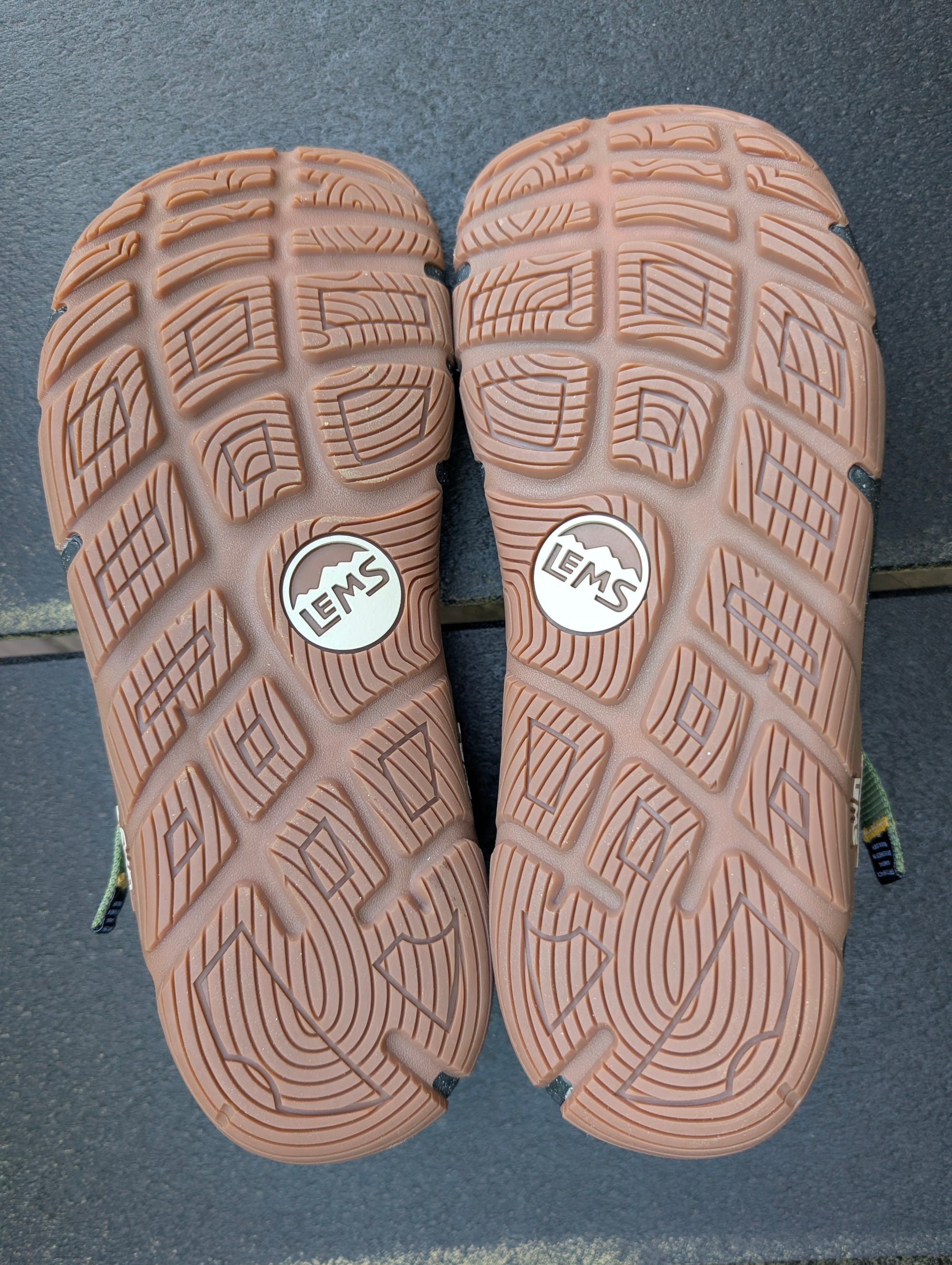 With such a stack height, the Lems Switchback will subdue a good bit of ground feel. Still, you’ll notice gravel, roots, and rocks on trails. I'd place the ground feel above Bedrock Sandals Cairn though less than LUNA Mono and certainly less than various ultra-minimalist Xero Shoes sandals. By way of a simple example of the ground feel, rolling a pea-sized, rough pebble on concrete, I can feel the roughness through the Switchback soles.