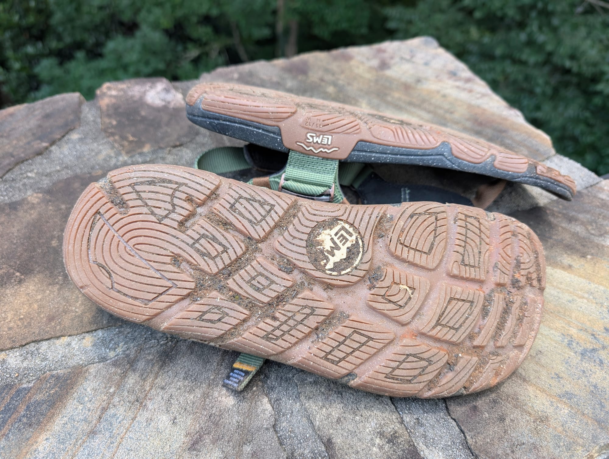 The 3.0 mm drop will bug minimalist purists. I am confident Lems has gotten and will get an earful about the sandals not being zero-drop. For me, I can't say I much noticed it, and maybe that's not surprising. I recently measured my two-year-old, thoroughly worn LUNA Mono Winged sandals. Those LUNAs use Vibram Morflex rubber, and on measuring with calipers, I note they are 7 mm thick at the ball of my foot and 10 mm thick at the heel, a 3–4 mm drop that didn't exist when they were new (15mm based on my calipers). I haven't noticed that drop either.