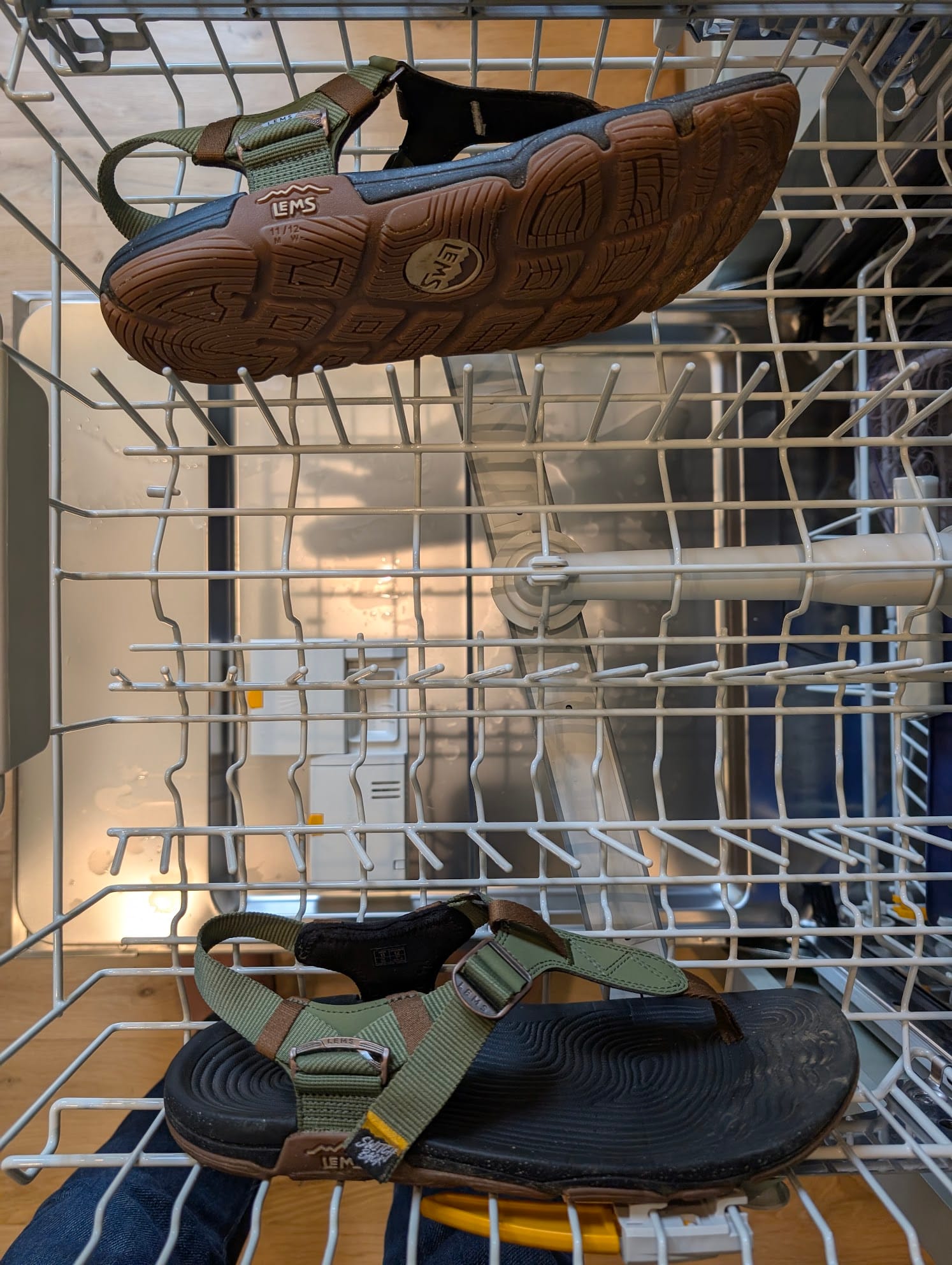 Mine survived this experiment fine, but disclaimer: Dishwash your sandals at your own risk! Don't try this at home as Lems doesn't advertise dishwashability as a feature. (First photo is before. Second photo is after.)