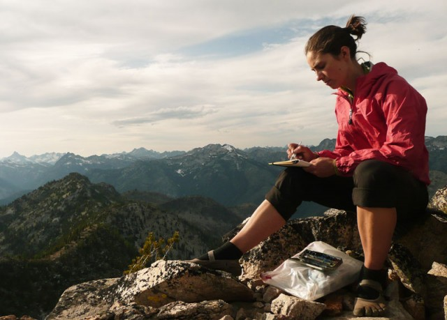 Maria Coryell-Martin sent in the above photos taken on her recent, two-night backpack in the North Cascade Mountains, which she completed wearing her Vibram fivefinger Sprints (and injinji socks). Maria wrote about her experience on her site, Expeditionary Artist, describing it thusly: