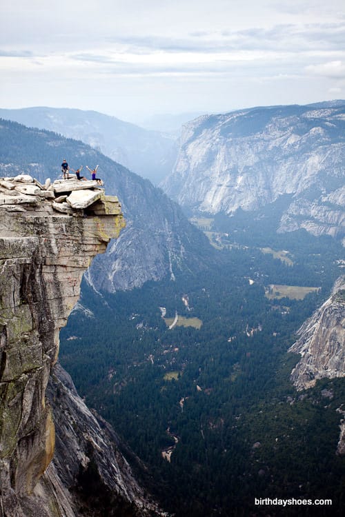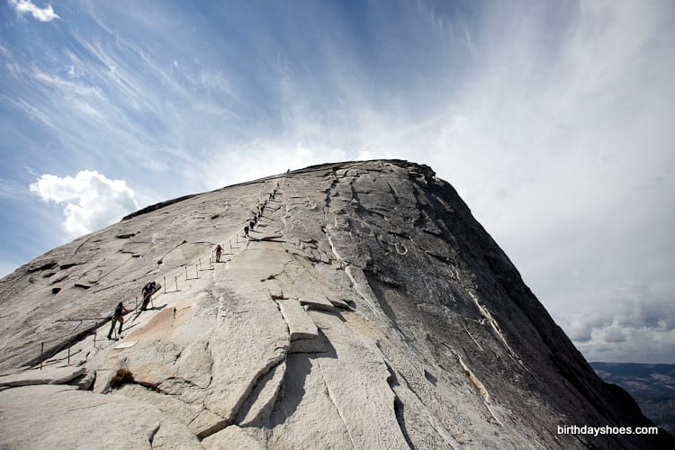 The final 400 feet to the top is the most famous thing about this climb. It’s an ascent on solid granite on about a 45 degree angle while holding onto nothing but two steel cables. It’s definitely dangerous if you are not careful and don’t have the proper gear. I saw people slipping and struggling in their boots at this steep angle, but my KomodoSports didn’t slip once. I was amazed at how well my soles gripped the granite. I felt like a gecko. The whole time people were asking me how I liked my shoes and wished that they had worn VFFs too! (Disclaimer: Don’t do this hike without training or knowing your limitations . . . it’s tough!)