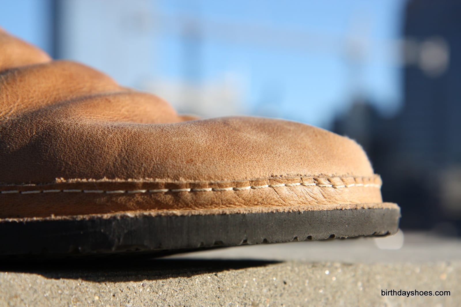 The Rogues have a supple leather used for the exterior of the shoes. It's very flexible out of the box and seems to comform to your feet over time. Note that your bare feet don't ever touch the leather due to the Rogue's Breathe-o-prene liner. You'll see a stitch that runs no longer than an inch at the front of the Rogue. This basically allows for a larger vertical space for toe wiggle room. This keeps the uppers from squishing the big toe and also from creating these toe bumps that just look kinda a little off.