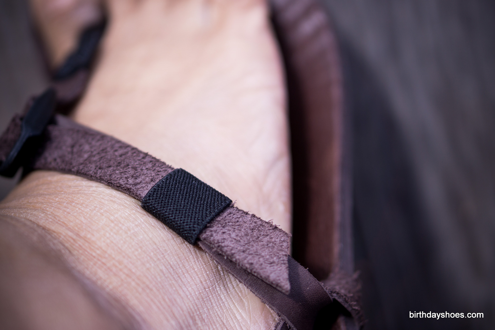 The entire shoe is constructed with just four materials: Leather, the vibram sole, and a bit of nylon and plastic for the buckle and countersunk toe post.