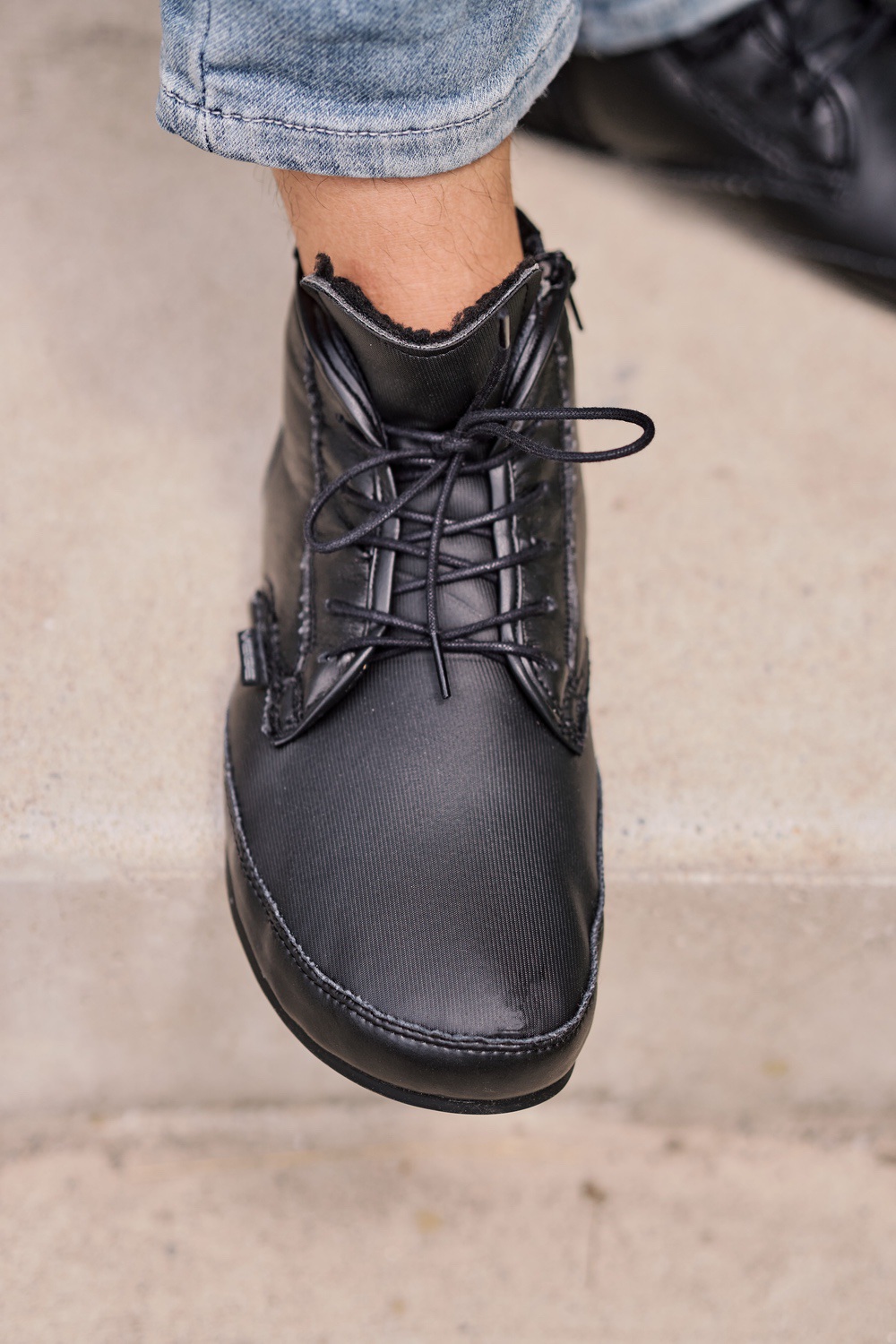 Tadeevo Vegan Winter minimalist shoes accomplish our concept of ultra minimalism. High flexibility, natural foot shape, zero heel-to-toe drop, lightweight construction and no artificial stabilization provide natural barefoot-like movement. The shoes look as if they had a small elegant heel. However, this is an optical effect created for purely aesthetic reasons, as the shoe has a slight recess inside the heel part of the sole. This means that the height difference between the heel and the toes is still exactly zero.